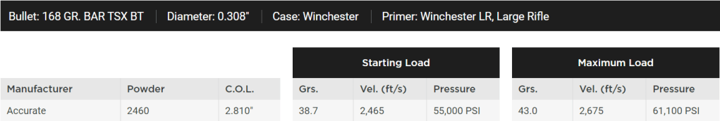 The LDC lists a starting load of 38.7 grains and a max load of 43.0 grains, achieving projected velocities of 2,465ft/s and 2675ft/s, respectively.