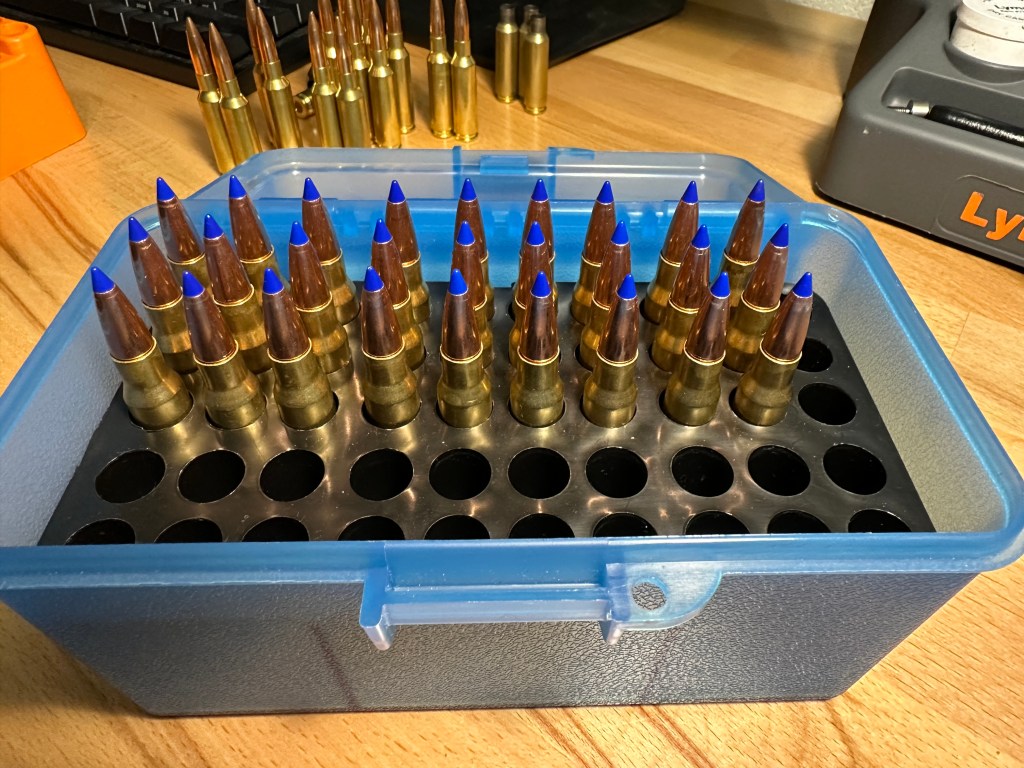 Normally, I would load 5 rounds for each powder charge. However, given the relatively high cost of the Barnes TTSX, I will be loading 3 rounds per powder charge for the initial ladder test. This will give us 27 total rounds. Once we get the powder charges narrowed down, I will up the number of rounds loaded.